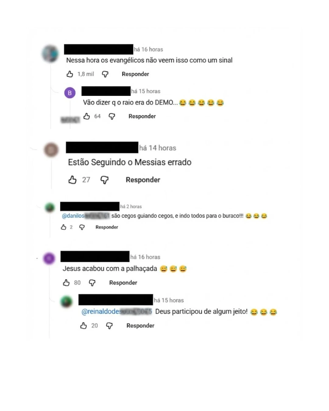 Frases como "Deus enviou o Raio", "Sinal divino!" e "Jesus acabou com a palhaçada" foram repetidas diversas vezes. Em alusão irônica ao sobrenome do ex-presidente (Messias), um usuário comentou: "Estão Seguindo o Messias errado". Outros comentários utilizavam emojis de risada para reagir à notícia dos feridos.